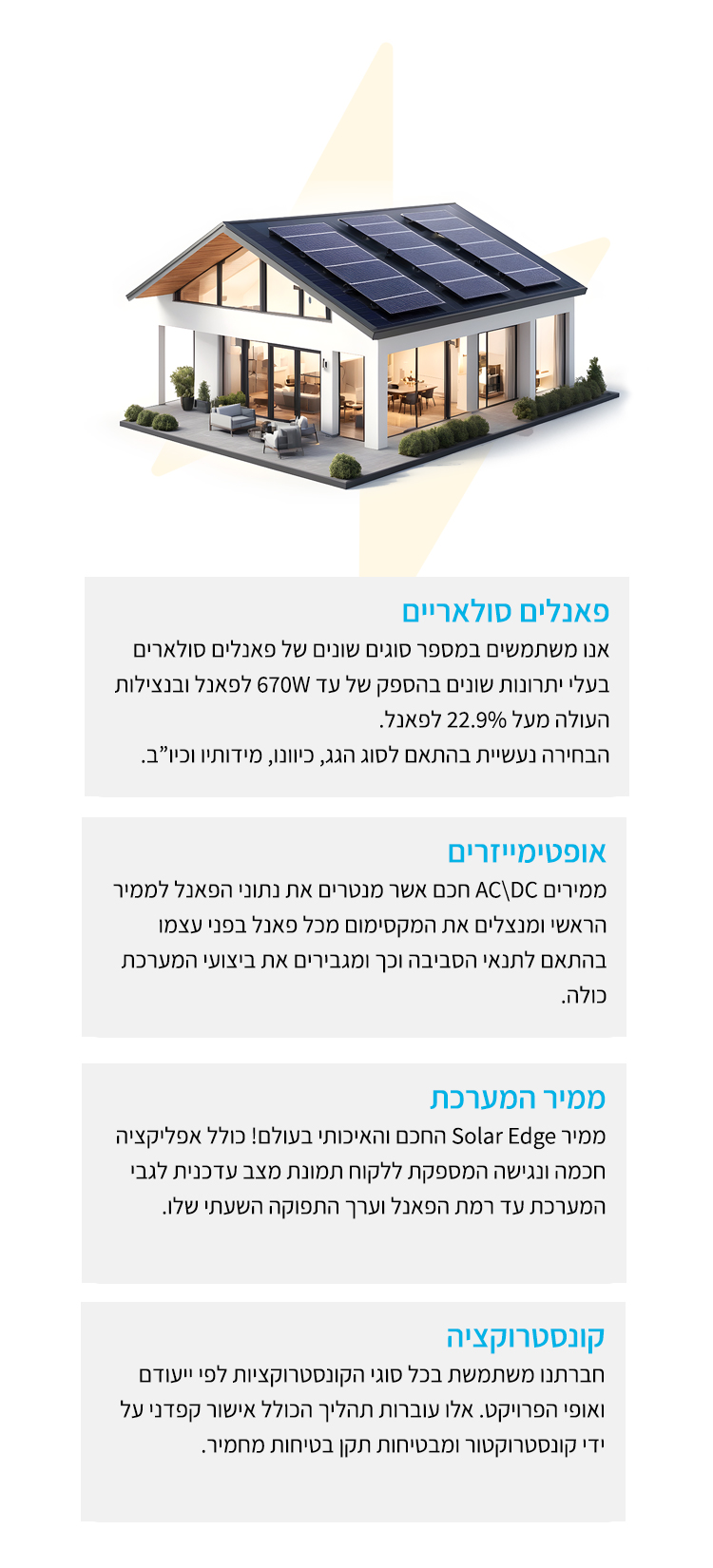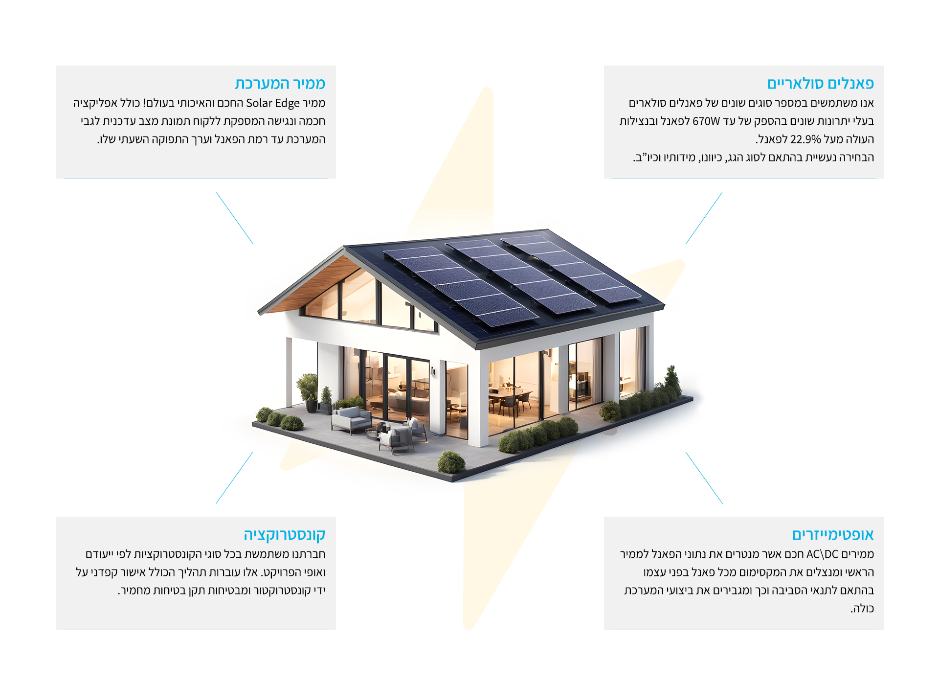 בEnergy Point, אנו מאמינים שכל בית יכול להיות מקור אנרגיה ירוק וחכם. עם צוות מומחים בתחום האנרגיה הירוקה, אנו מציעים התקנת מערכת סולארית שתאיר את ביתכם ותחסוך לכם עלויות. עם מערכת סולארית לבית, אתם לא רק מפחיתים את ההוצאות, אלא גם משפרים את איכות הסביבה בה אתם חיים.